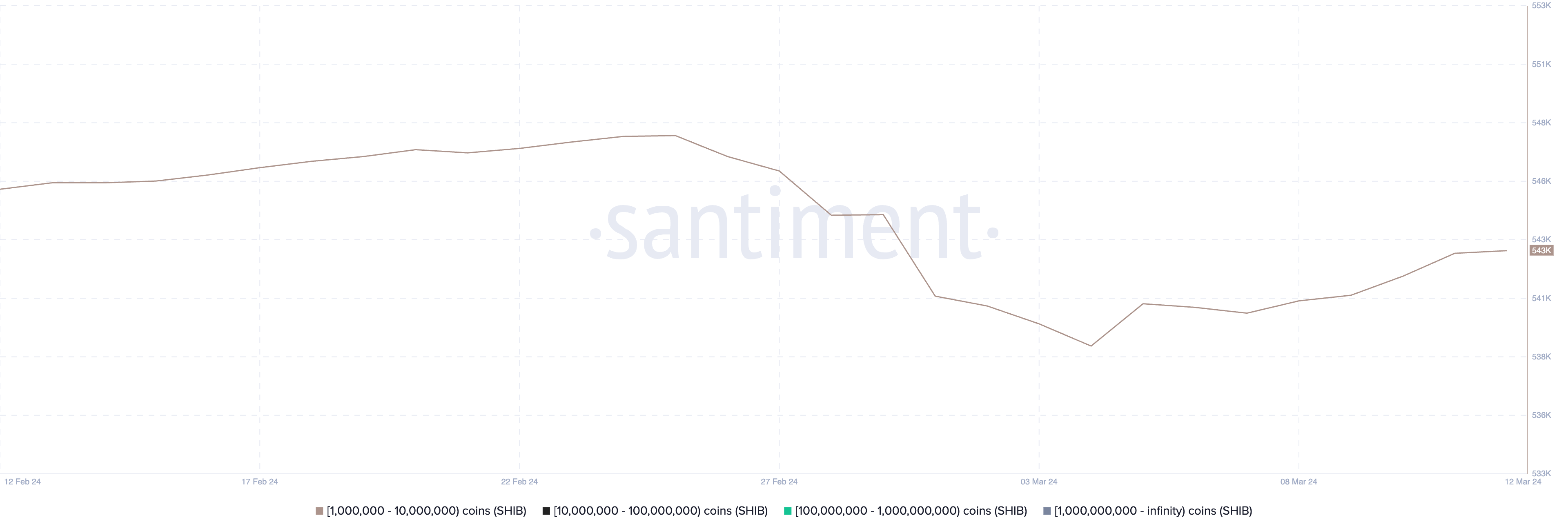 Tras este periodo, del 4 al 12 de marzo, la demografía de holders dentro de este rango repuntó ligeramente, pasando de 539,000 a 543,000. Esta pauta sugiere que, tras capitalizar sus ganancias, un segmento de los holders de SHIB recuperó el activo.