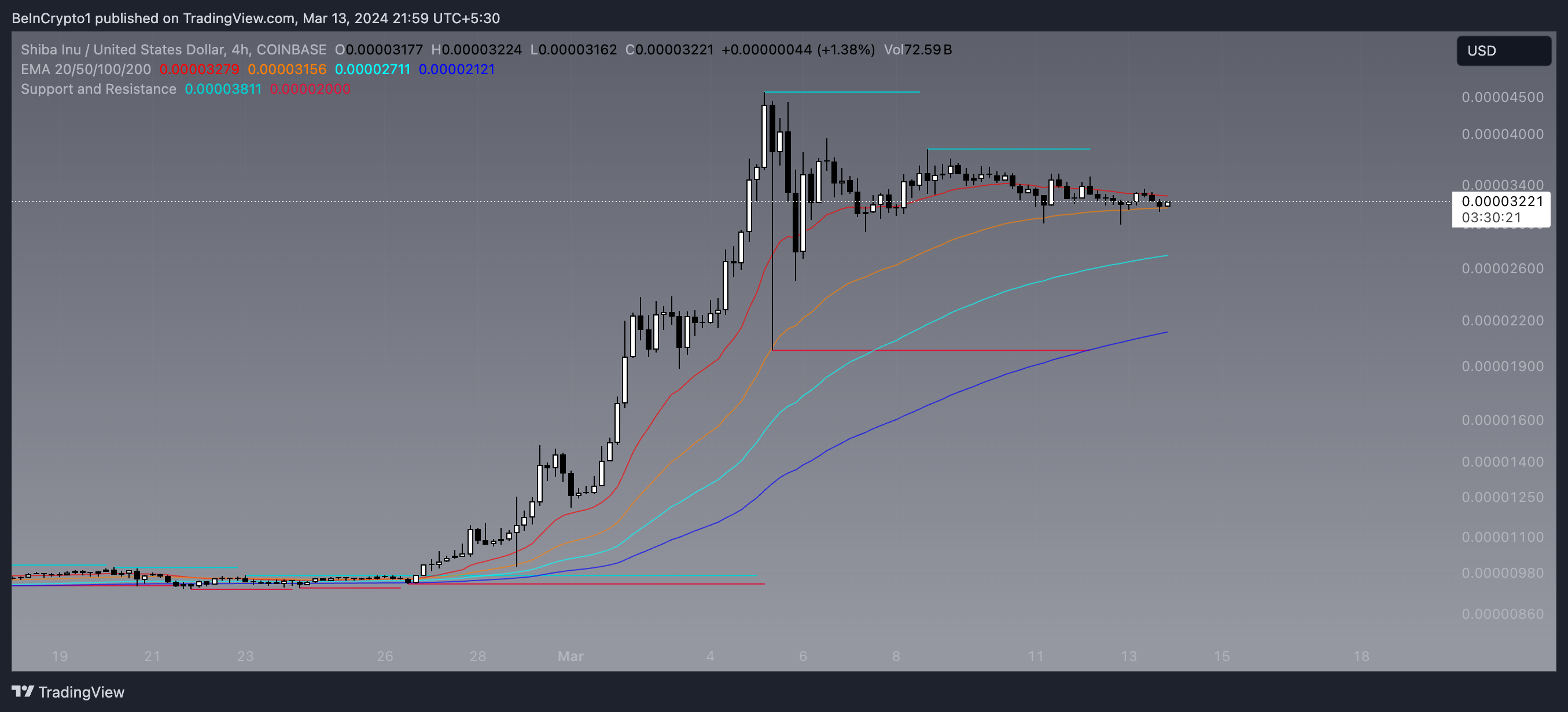 Al analizar el gráfico de 4 horas de SHIB, resulta evidente que las medias móviles exponenciales (EMA) sugieren un estado de consolidación del mercado. En concreto, se observa que la EMA 20 se encuentra muy próxima tanto al precio como a la EMA 50.