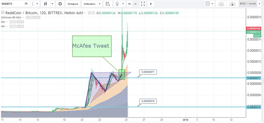 Otra moneda parecida a RED coin fue Reddcoin (RDD), un token promocionado de manera activa por John Mcafee, el genio de los antivirus y gran entusiasta de las criptomonedas, quien actualmente está preso en España mientras espera ser extraditado a los EE.UU por evasión de impuestos. A día de hoy, RDD ha bajado un 76.07% respecto a su ATH.