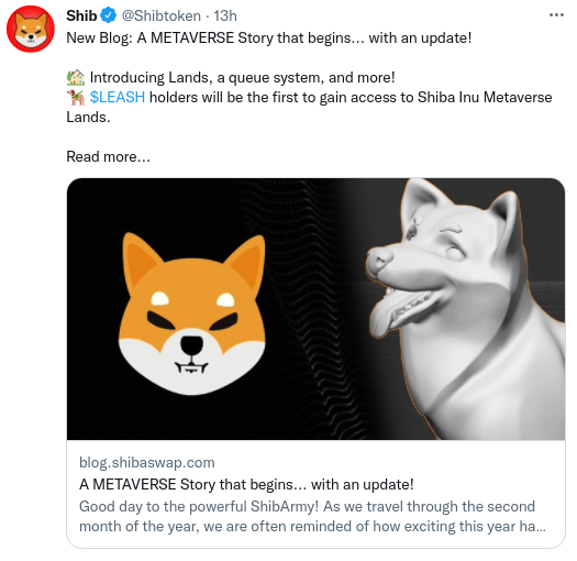 Los desarrolladores de Shiba Inu (SHIB) anunciaron que el protocolo ofrecería parcelas de tierras virtuales a través del metaverso. Gracias a la noticia, el token LEASH se disparó más del 40%.