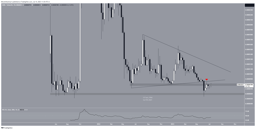 Según el análisis técnico realizado en un marco de tiempo semanal, el precio de Shiba Inu se enfrenta a una fuerte perspectiva bajista. Esta predicción se basa en la ruptura de un patrón de triángulo simétrico que se había estado formando desde junio de 2022.
