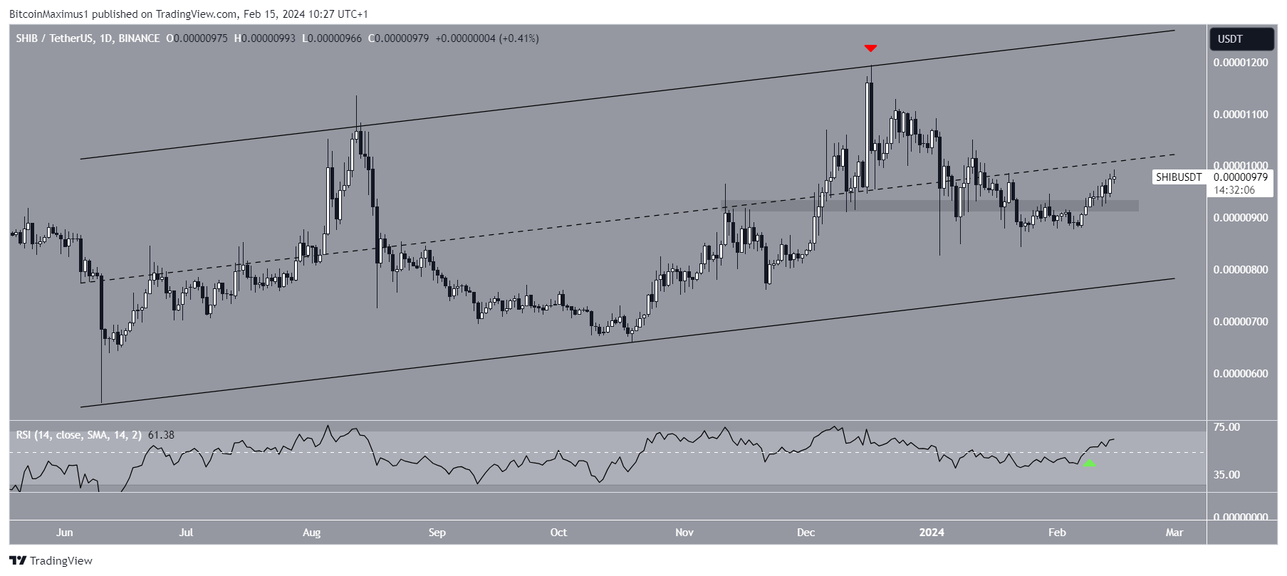 El precio de Shiba Inu se negocia dentro de un canal paralelo ascendente desde junio. El aumento llevó a un máximo de 0.0000120 dólares en diciembre de 2023 (icono rojo).