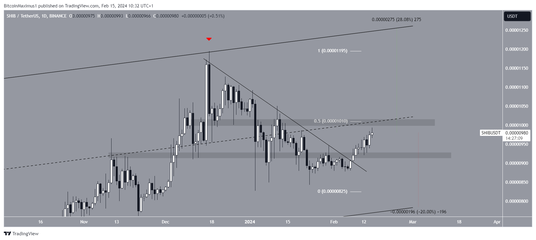 Un análisis más detallado del movimiento desde el marco de tiempo diario muestra que SHIB rompió una línea de tendencia de resistencia descendente el 9 de febrero. Esto catalizó el movimiento alcista.
