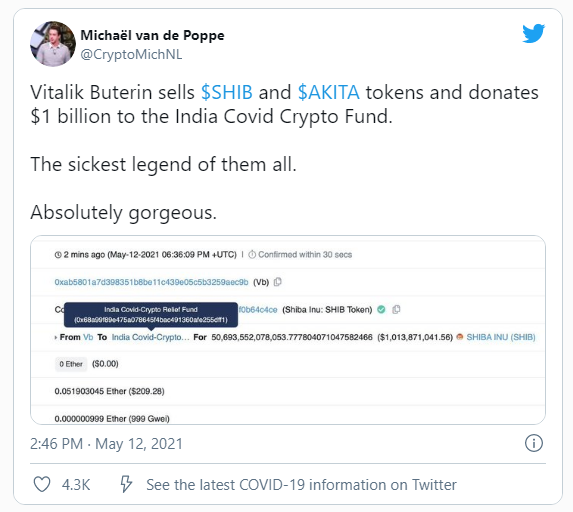 Se han donado varios tokens sin liquidar: el equivalente a 500 millones de dólares para Gitcoin, centrado en software libre, y 1 mil millones de dólares para combatir la pandemia en India.