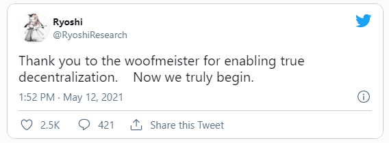 “Gracias a ti, woofmeister por permitir una verdadera descentralización. Ahora realmente comenzamos”.