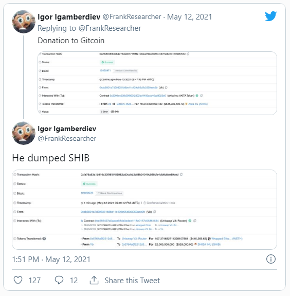 Además de SHIB, Buterin se deshizo de los tokens AKITA, otro de los muchos tokens memes que recibió por sorpresa en las últimas semanas.