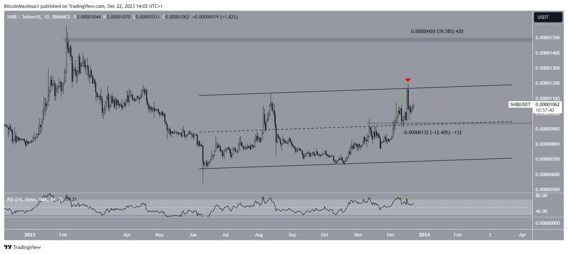 SHIB alcanzó la línea de tendencia de resistencia del canal el 17 de diciembre (icono rojo) y fue rechazado, creando una vela bajista.