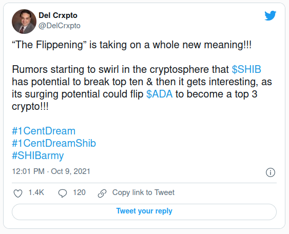 “’El flippening’ está adquiriendo un significado completamente nuevo!!! Los rumores están comenzando a arremolinarse en la esfera cripto de que $SHIB tiene el potencial de estar entre los diez primeros y después volverse interesante, ya que su potencial de crecimiento podría superar a $ADA como una de las tres principales criptomonedas”.