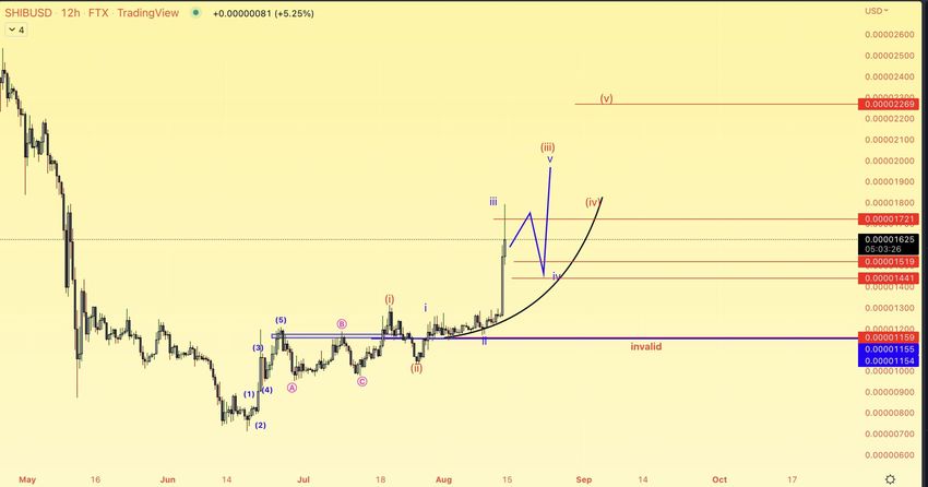 El recuento de ondas más probable indica que SHIB está en la onda tres de un movimiento ascendente de cinco ondas. El recuento de sub-ondas se indica en amarillo.