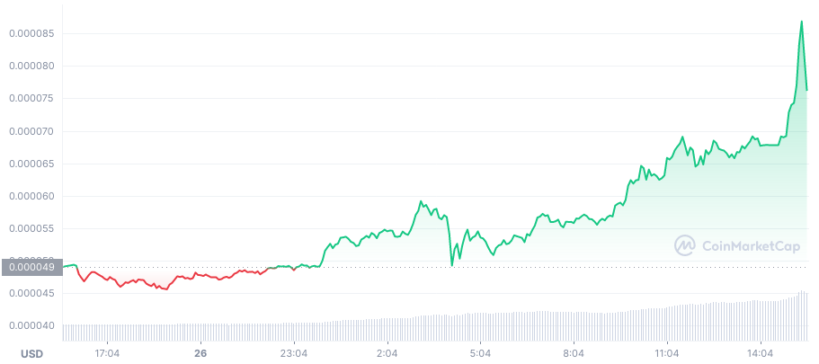 El “Dogecoin killer“ registró hace pocos minutos un nuevo máximo histórico de 0.00008327 dólares, un aumento descomunal del 60% en las últimas 24 horas. Desde entonces ha retrocedido un poco y cotiza actualmente en 0.00007192 dólares.