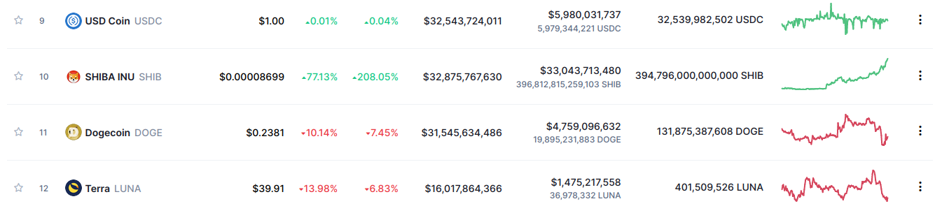 SponsoredEste precio de Shiba Inu impulsó también su capitalización de mercado hasta un nuevo ATH de 32,8 mil millones de dólares, ingresando por algunos instantes al top 10 criptomonedas, según los datos de CoinMarketCap.