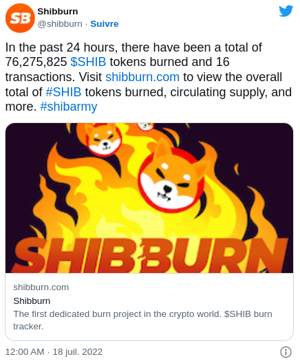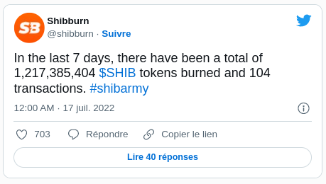 SponsoredSegún los datos compartidos y actualizados diariamente por la cuenta de Twitter y el sitio de quema de tokens, el shibburn, ya se han retirado más de 410.373.764.750.087 tokens de la oferta original, es decir, casi la mitad de la cantidad máxima de tokens.
