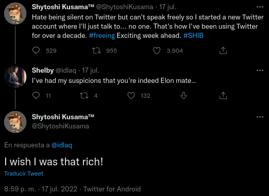 Las descabelladas teorías apuntan principalmente a Elon Musk, el caprichoso multimillonario, CEO de SpaceX y Tesla entre otros, partidario de Bitcoin y que multiplica las “promociones” de Dogecoin. De hecho, las voces que piensan que Elon Musk resulta ser Shytoshi Kusama son más frecuentes dentro del “shibarmy“.