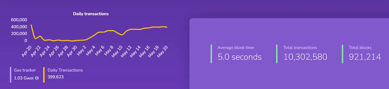 Mientras tanto, las transacciones diarias en la red han ido en aumento desde mediados de mayo. La red ha promediado más de 300,000 transacciones diarias desde el 12 de mayo.