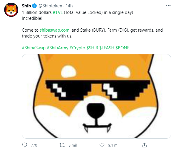 De acuerdo a una publicación en la cuenta oficial de Twitter de Shiba Inu, ShibaSwap superó los 1 mil millones de dólares en TVL 24 horas después de su lanzamiento oficial: