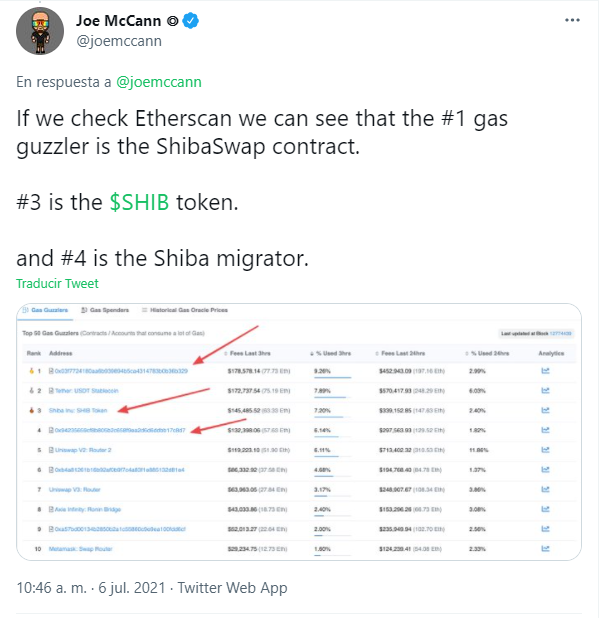 De acuerdo a lo señalado el día de ayer por el trader e inversor @joemccann, el contrato ShibaSwap encabezó la clasificación de tarifas de transacción de la red Ethereum (ETH).