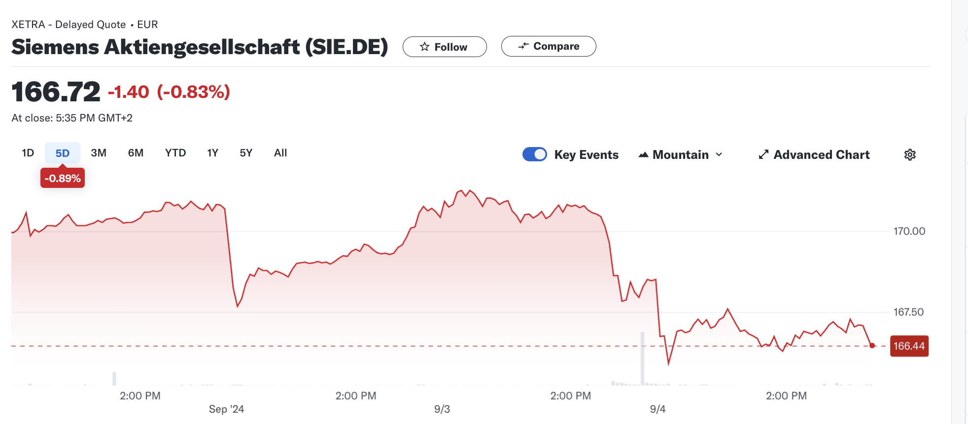 Tras el anuncio, las acciones de Siemens (SIE.DE) se desplomaron, al pasar de 171,2 dólares a 165,9 dólares, y opera con pérdidas de 1,40%, mientras que la capitalización de mercado se sitúa en 131,7 mil millones de dólares. No obstante, las acciones están lejos de su máximo histórico de febrero pasado, cuando alcanzó los 182 dólares.