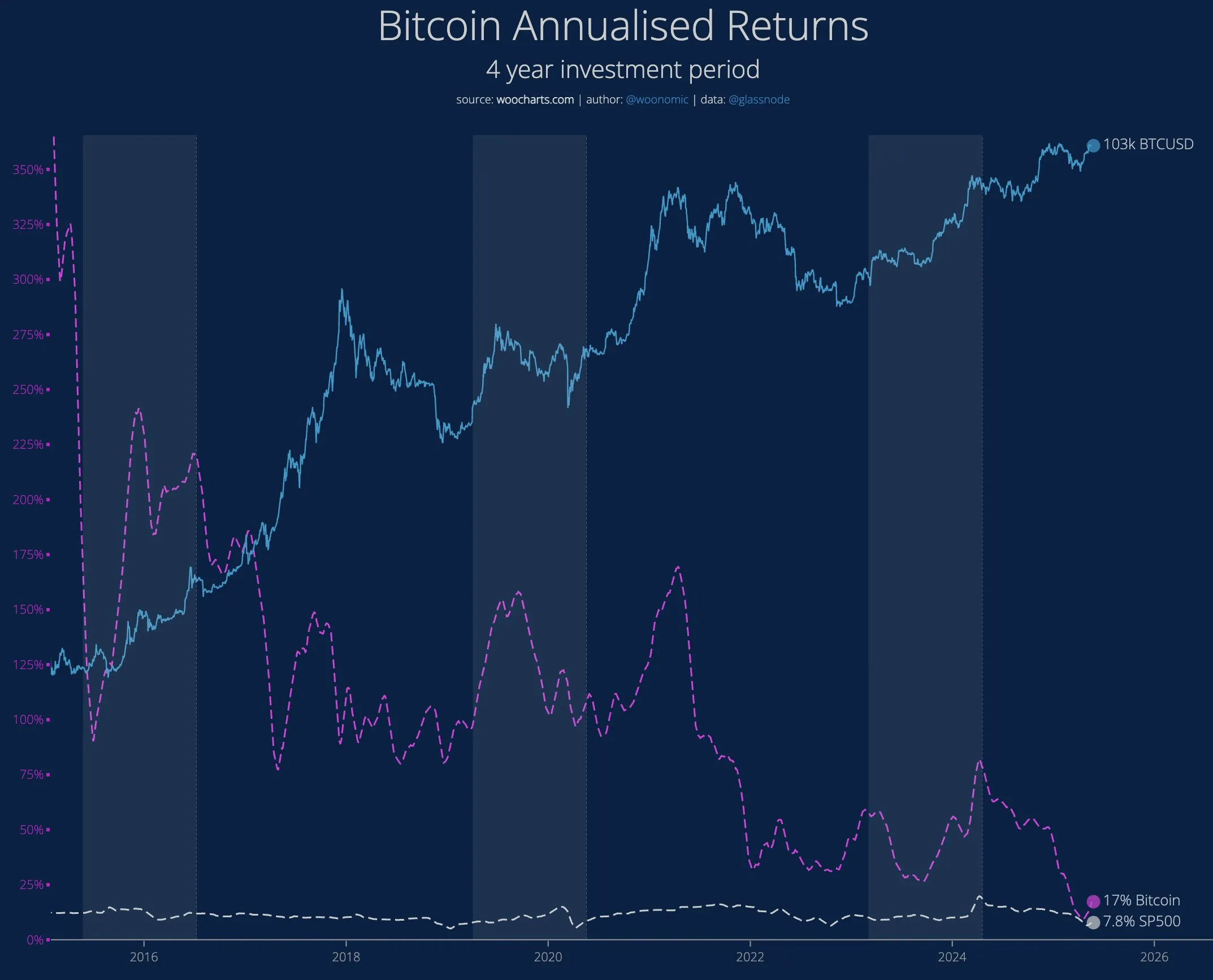 Woo compartió un gráfico titulado “Retornos Anualizados de Bitcoin”, que muestra que la tasa de crecimiento anual compuesta (CAGR) de Bitcoin ha caído drásticamente, de más del 100% en 2017 a alrededor del 30–40% después de 2020.