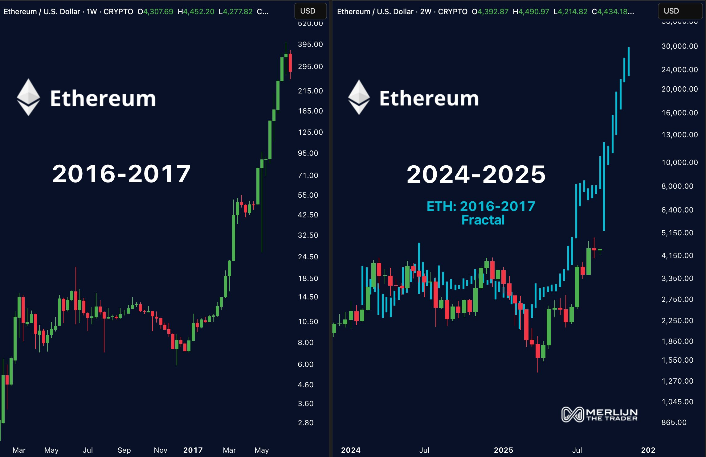 Al comparar los gráficos del fractal de 2016-2017 y el escenario actual, la proyección del analista apunta a un precio hipotético de Ethereum en 30,000 dólares.