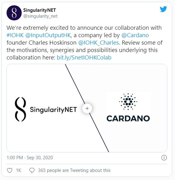 SingularityNET acaba de anunciar una colaboración con IOHK, la firma dirigida por el fundador de Cardano, Charles Hoskinson. El anuncio agregó que los equipos de IOHK y SingularityNET han estado “discutiendo seriamente” lo que se necesitaría para trasladar una parte significativa del protocolo de inteligencia artificial descentralizada de Ethereum a Cardano.