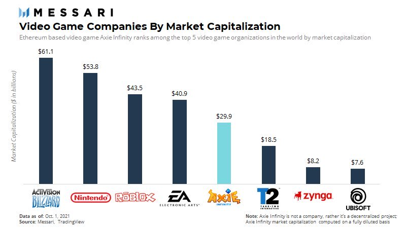 De acuerdo a los datos de Messari, Axie Infinity (con una valoración aproximada de 30 mil millones de dólares) se ubica como la quinta empresa de videojuegos más grande de todo el mundo, solamente superada por Activision Blizzard, Nintendo, Roblox y Electronic Arts.