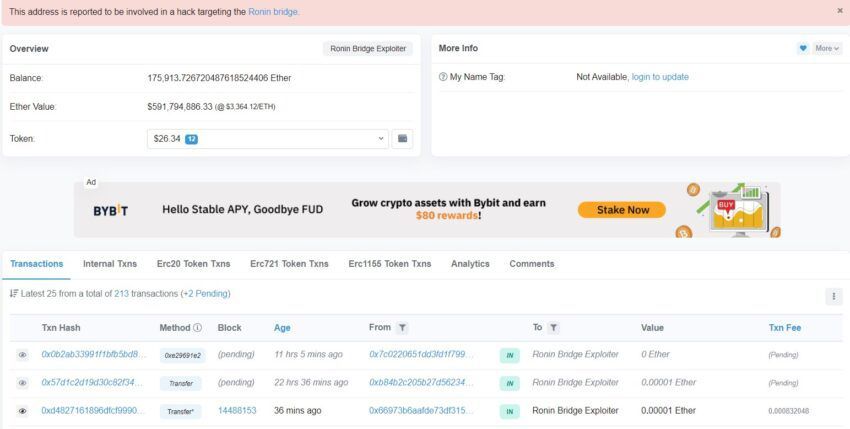 Mientras tanto, al momento de escribir este artículo, el valor del monedero Etherscan refleja que la mayoría de los fondos permanecen inalterables con Ronin Bridge Exploiter.