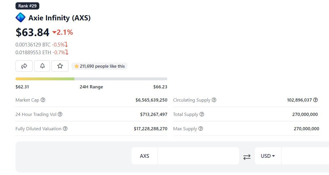 Dicho esto, Axie Infinity ha perdido el 8% de su valor en las últimas 24 horas en CoinGecko. En el momento de la publicación, AXS cotiza ligeramente por encima de 64 dólares.