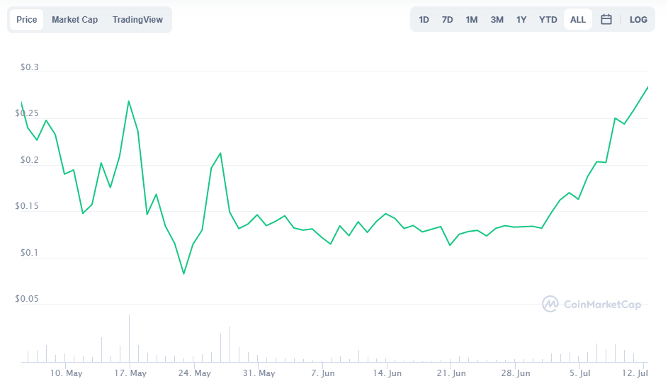 De acuerdo a los datos de CoinMarketCap, SLP se cotiza actualmente en 0,2808 dólares, lo que representa un incremento del 17% en las últimas 24 horas.