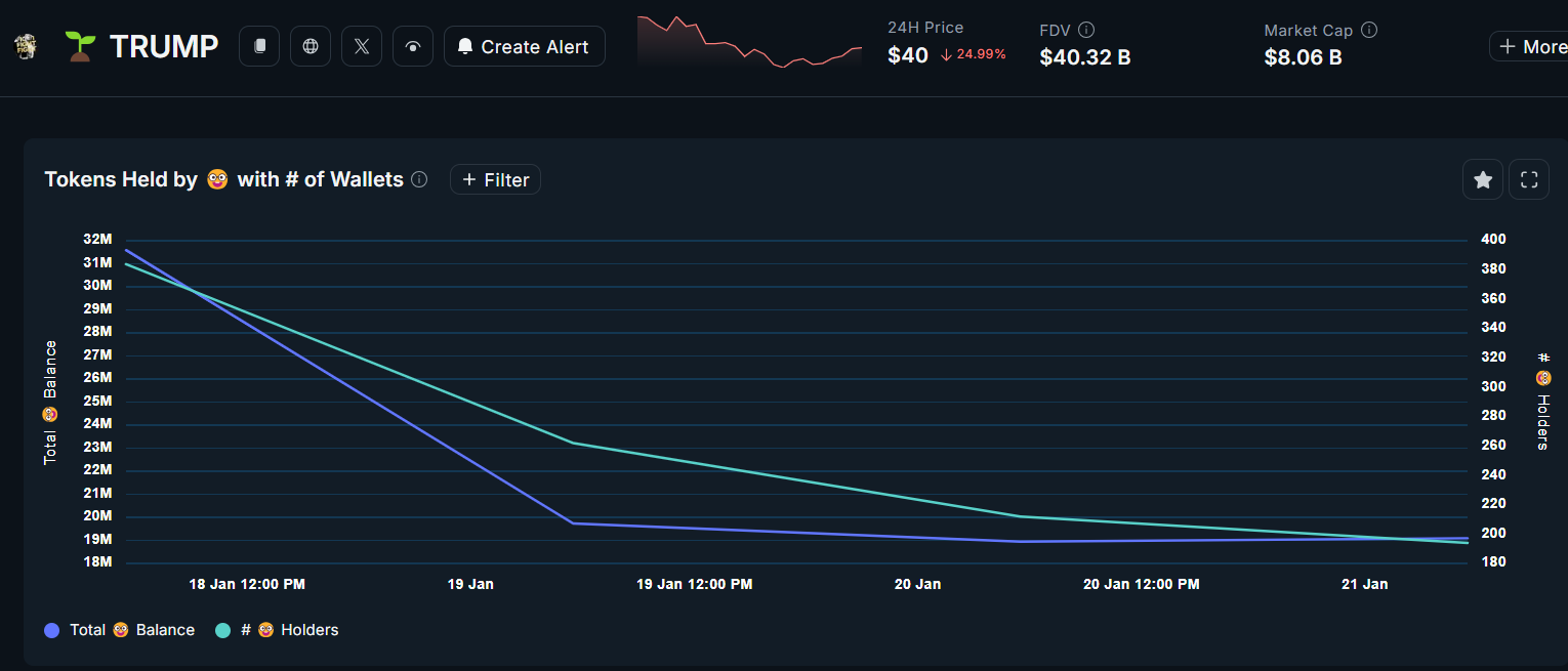 Según datos de Nansen, los smart money traders han salido de sus posiciones en TRUMP. Tras la acumulación máxima registrada el 18 de enero, se puede ver que los traders han ido abandonando lentamente a TRUMP.