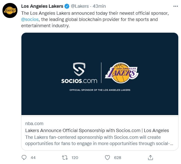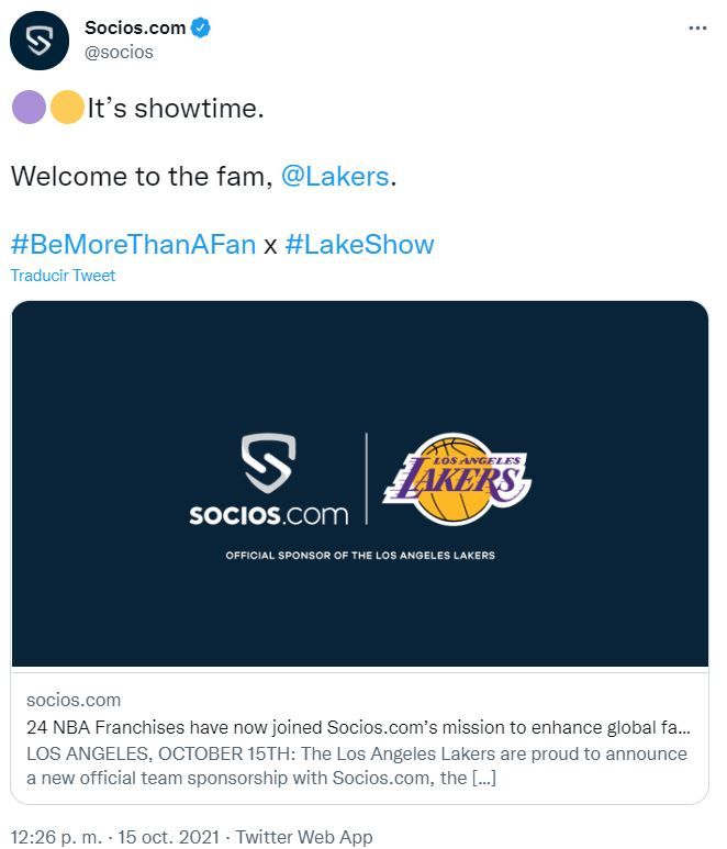 Socios.com es el nuevo patrocinador de redes sociales de Los Lakers, y se encargará de optimizar la experiencia de usuario y aparecerá en transmisiones especiales, aunque no revelaron alguna fecha de lanzamiento para un fan token.