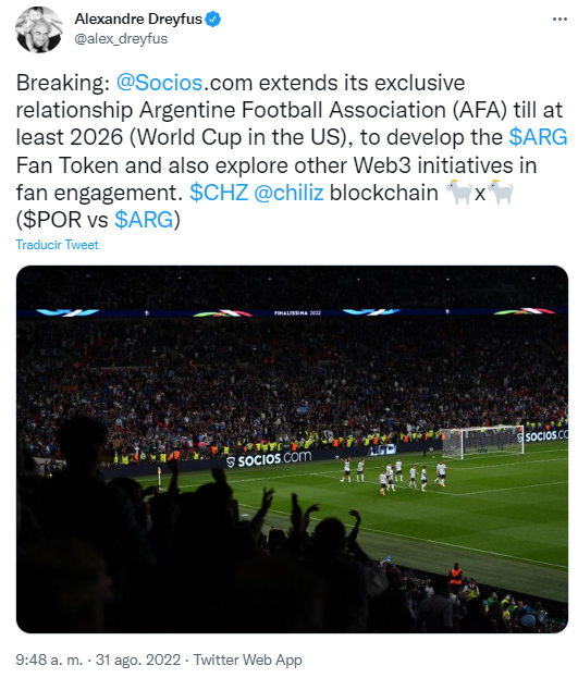 El CEO de la blockchain Chiliz, Alexandre Dreyfus, hizo el anuncio en Twitter. Socios también ayudará a la Asociación del Fútbol Argentino a desarrollar su fan token $ARG y crear una comunidad global de participación y recompensas centrada en el token.