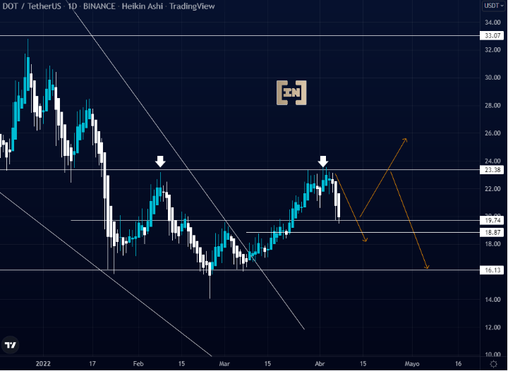 La cotización de DOT al igual que otras criptomonedas se encuentra en una zona de basta confluencia. Para el caso e Polkadot es el área de soporte de los 19.74 dólares a los 18.87 dólares.