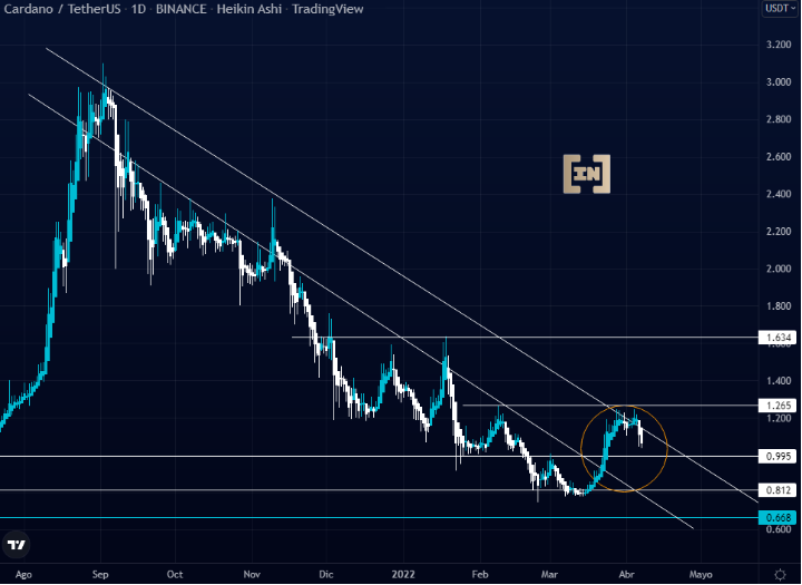 Cardano no logra superar la barrera de los 1.265 dólares y desciende a los 0.995 dólares.