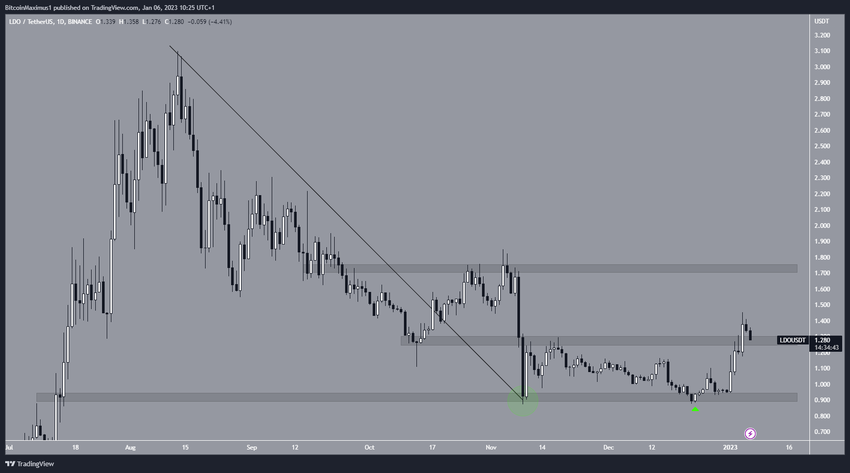 Entre el 9 de noviembre y el 22 de diciembre, el precio LDO creó un patrón de doble fondo dentro del área de soporte horizontal de 0.90 dólares. Esto ocurrió después de que el precio rompiera una línea de resistencia descendente.