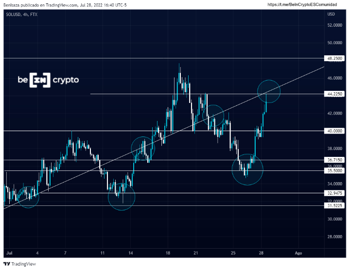 Solana se impulsa por intentar superar la barrera de los 44.23 dólares.