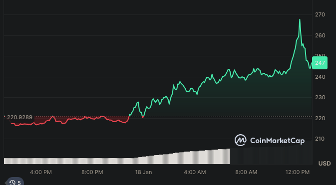 Actualmente cotiza en aproximadamente 245.56 dólares tras una corrección considerable. Sin embargo, la altcoin había experimentado un notable aumento del 20% para alcanzar su ATH en 268.75 dólares y su volatilidad sigue siendo notablemente alta.