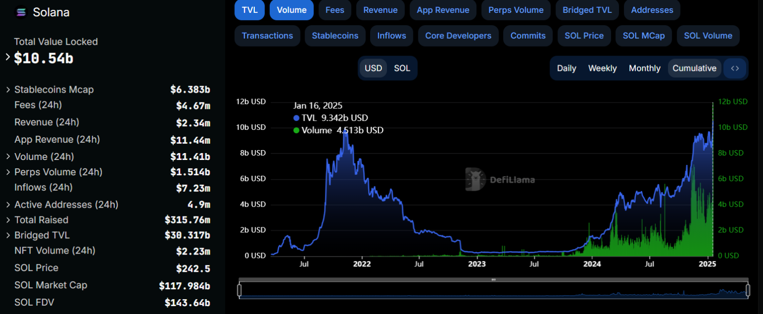 El nuevo máximo histórico de Solana no se limitó a la acción del precio de SOL. Métricas clave, como el TVL de la blockchain, como la actividad en los exchanges descentralizados (DEX) experimentaron aumentos masivos.