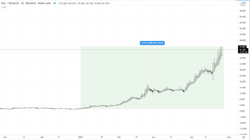 SponsoredEl proyecto se ha disparado un asombroso 62% en los últimos siete días, alcanzando un nuevo máximo histórico de 43,64 dólares en Binance. Aún más impresionante es que Solana ha subido más del 2.800% solo en 2021.
