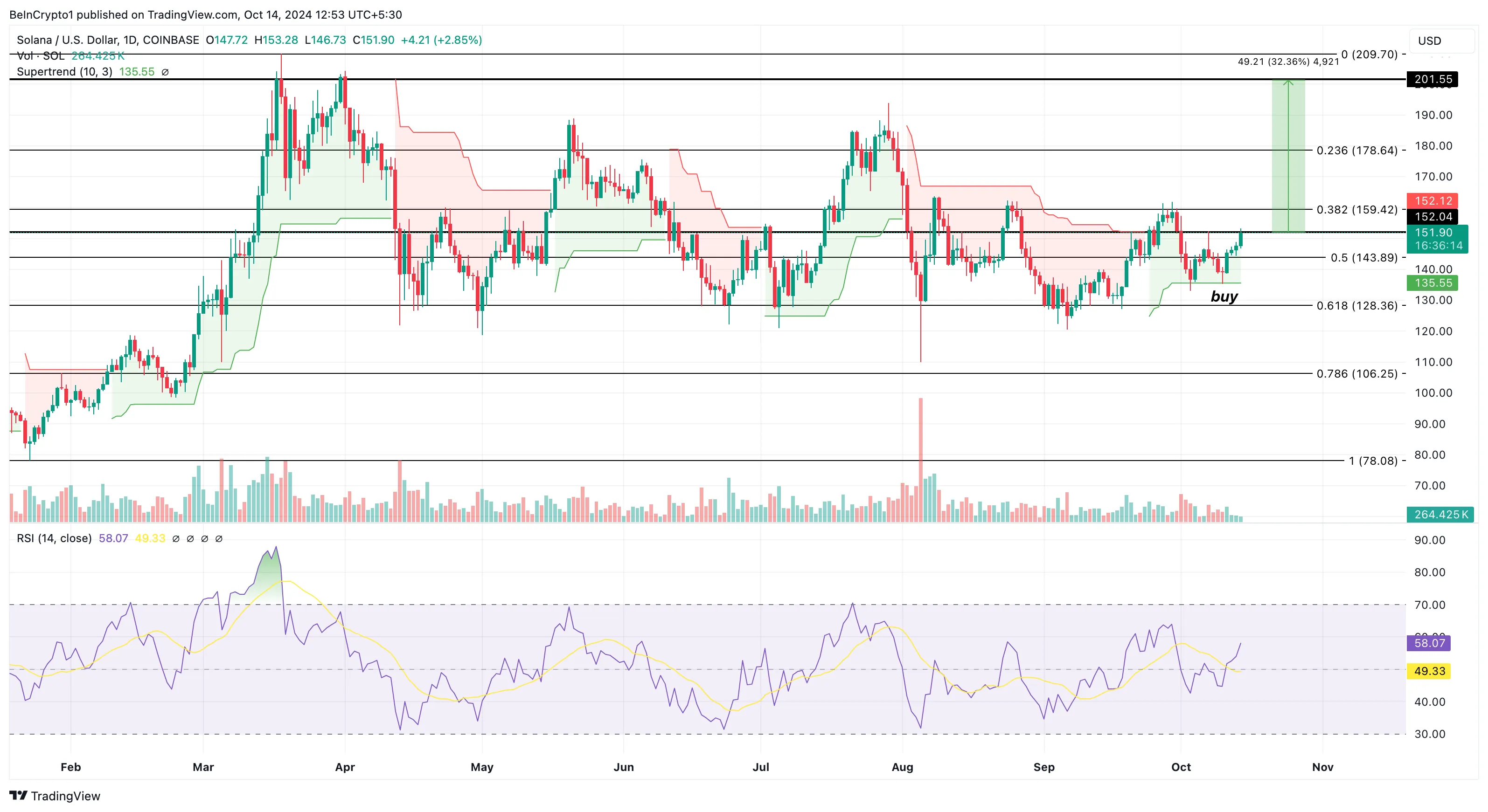 En el gráfico diario, el precio de SOL está buscando superar la resistencia de 159,42 dólares. Esta ruptura podría ser posible debido al aumento del Índice de Fuerza Relativa (RSI).