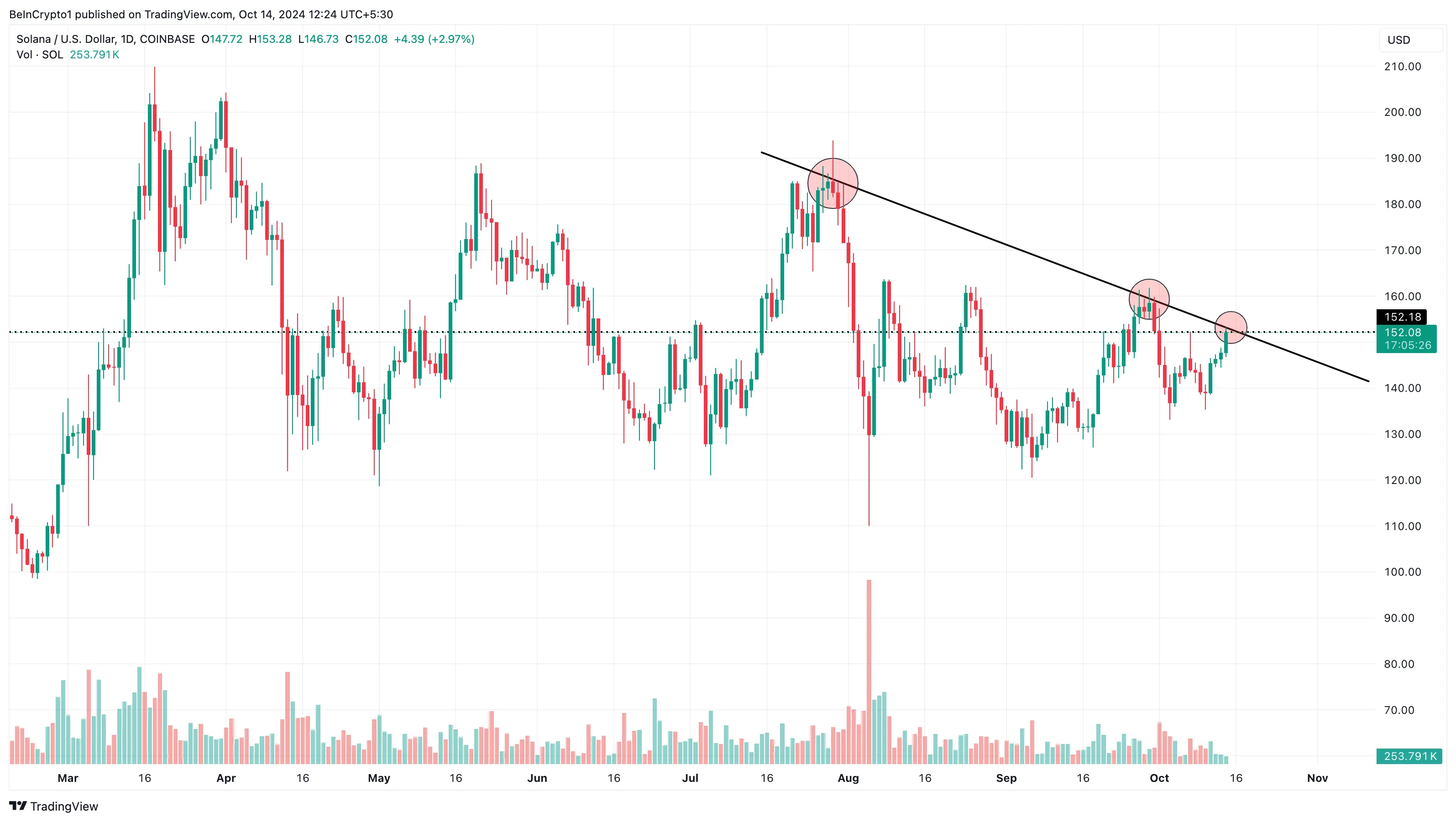 Ahora, con el token recuperándose a 152,08 dólares, parece que Solana podría haber superado lo peor de sus pérdidas. Este último repunte aumenta las esperanzas de liberarse de la línea de tendencia descendente que ha mantenido a SOL limitado desde finales de julio.