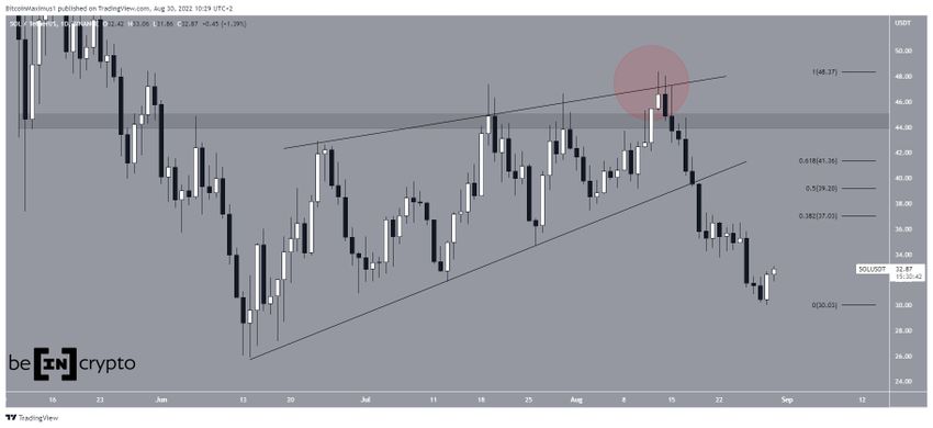 SponsoredSOL ha estado cayendo desde entonces y rompió la cuña el 18 de agosto. El precio alcanzó un mínimo de 30 dólares el 29 de agosto. Generó una vela envolvente alcista y ha estado aumentando desde entonces.