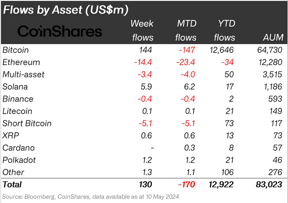 En la semana que finalizó el 10 de mayo, SOL se convirtió en la altcoin con mayores flujos de entrada, que ascendieron a casi 6 millones de dólares. Esto elevó los flujos netos en lo que va de año de 11,1 millones de dólares a 17 millones de dólares.