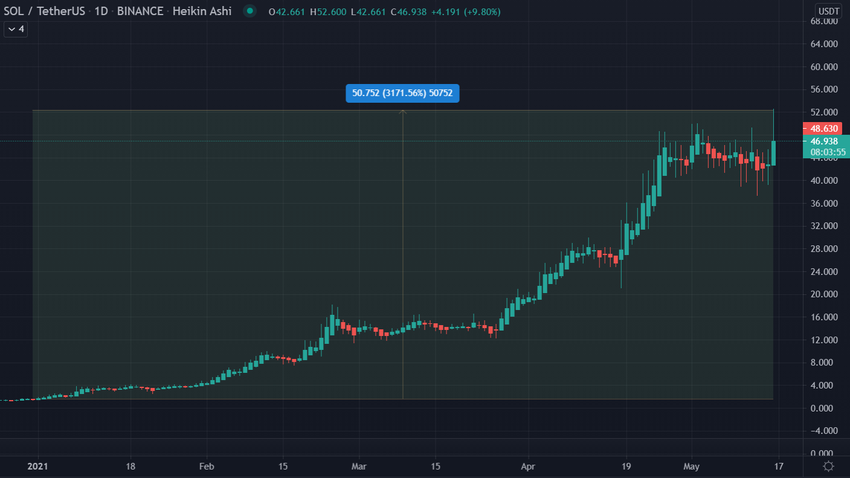 No está mal considerando que comenzó el año con un precio de 1.51 dólares. El reciente máximo histórico ahora significa que SOL ha experimentado un aumento del 3,100% solo en 2021.