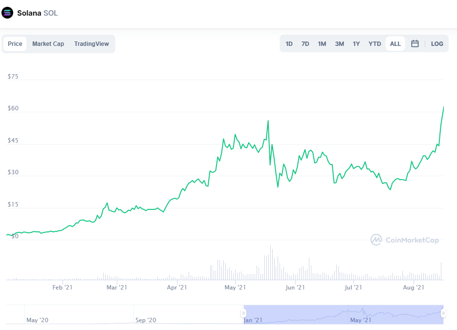 El token nativo de Solana, SOL, alcanzó un nuevo récord tras superar el lunes 16 de agosto la marca de los 60 dólares en medio de la adopción acelerada de la red.