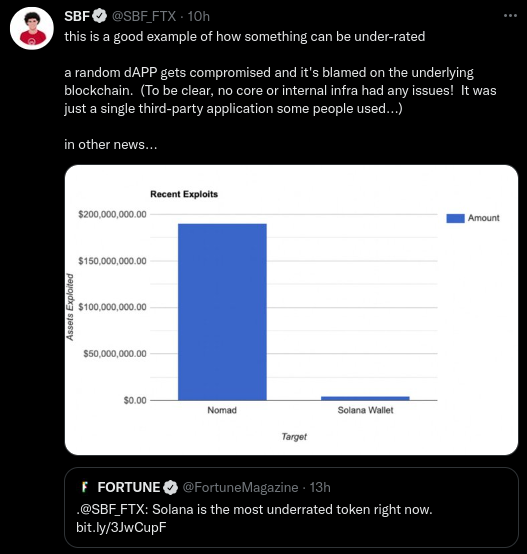 En medio de la crisis que atraviesa Solana tras el reciente hack por 8 millones de dólares, el CEO de FTX, Sam Bankman-Fried, ha señalado que el token SOL es el “mas subestimado”, al menos desde hace un mes.