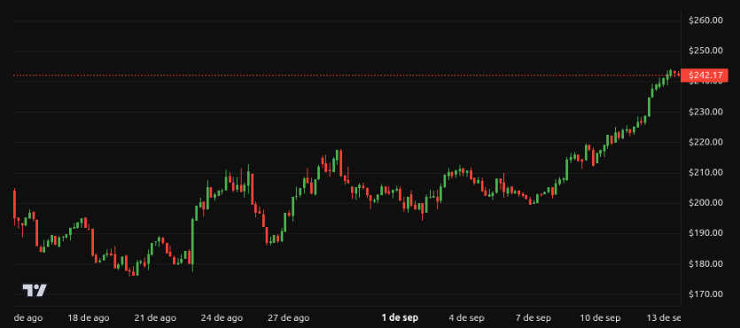 El impacto se refleja en el mercado: el precio de SOL subió hasta los 242,09 dólares, con un incremento diario del 1.09%. El rally de SOL muestra señales técnicas positivas. La ruptura de la resistencia en 229 dólares abre camino hacia los 263 dólares, con un objetivo extendido cercano a 320 dólares si persiste la presión compradora.