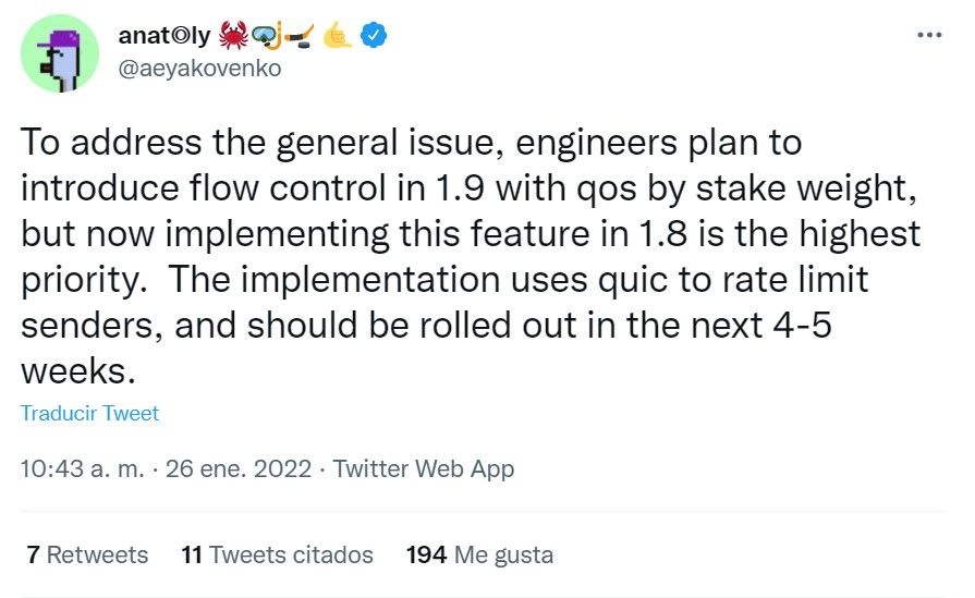 A través de su cuenta oficial en Twitter, el CEO de Solana, Anatoly Yakovenko, explicó los últimos problemas que ha tenido su red en esta semana y anunció que entre 4 a 5 semanas vendrán actualizaciones para la red que resolverán los problemas que ésta ha presentado.