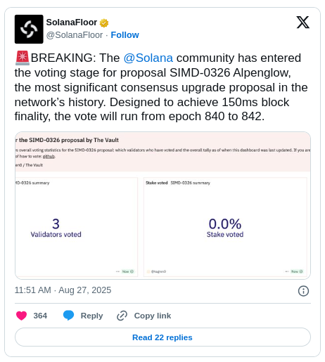 Solana inició la fase de votación para su muy esperado upgrade Alpenglow, una revisión de consenso que podría marcar el mayor cambio en la historia de la red.