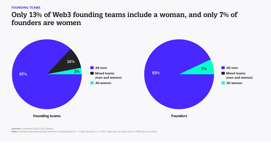 La consultora Boston Consulting Group (BCG), en un estudio junto a la a compañía de desarrollo de contenidos para la Web3 People of Crypto Lab concluyó que existe una brecha de género más que evidente en las startups de Web3. Las cifras indican que solo un 13% de los equipos fundadores incluye una mujer.