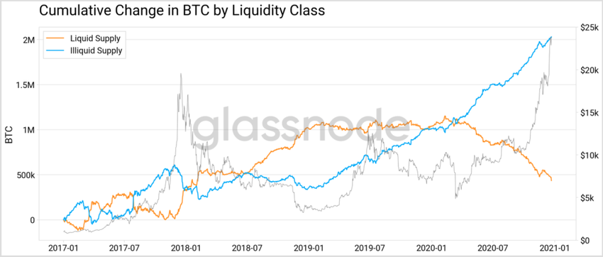 La impresionante valoración del 280% de Bitcoin este año impactó su liquidez – o la falta de ella. Según el informe, más de 1 millón de BTC se volvieron ilíquidos en el transcurso de 2020.